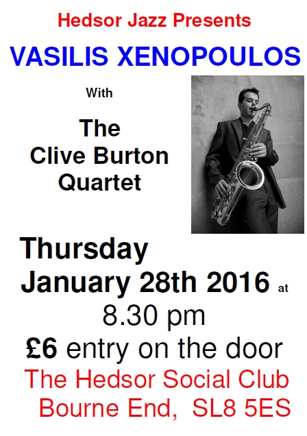 Joining Clive Burton and the almost regular quintet is the internationally acclaimed saxophonist Vasilis Xenopoulos. Anyone who has heard him before will realise what an exciting player he is, and how much he is in demand, but due to our long standing association with him at Hedsor, he is pleased to come and join us at less than normal commercial costs!! So, for our normal admission price of £6 you will be able to enjoy an evening of wonderful jazz. No food this week, but you do have the prospect of absolutely wonderful music.